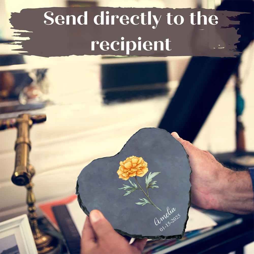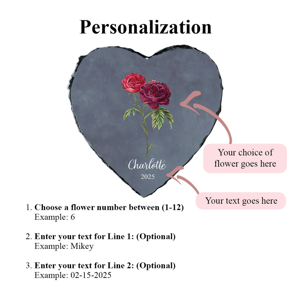 This personalized plaque offers a meaningful way to honor a loved one's birth month or a special occasion. We will customize the heart stone with the name of the person being honored and a significant date, featuring their exquisite birth month flower as the centerpiece. This lasting bloom serves as a permanent tribute, quietly celebrating their life and spirit.