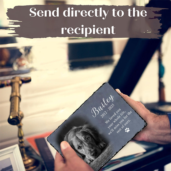We will customize this slate-look stone with your pet's favorite photo, their name, and their significant dates, alongside the heartfelt quote of your choice. This lasting design serves as a permanent keepsake for the garden or home, quietly celebrating the unconditional love they shared.